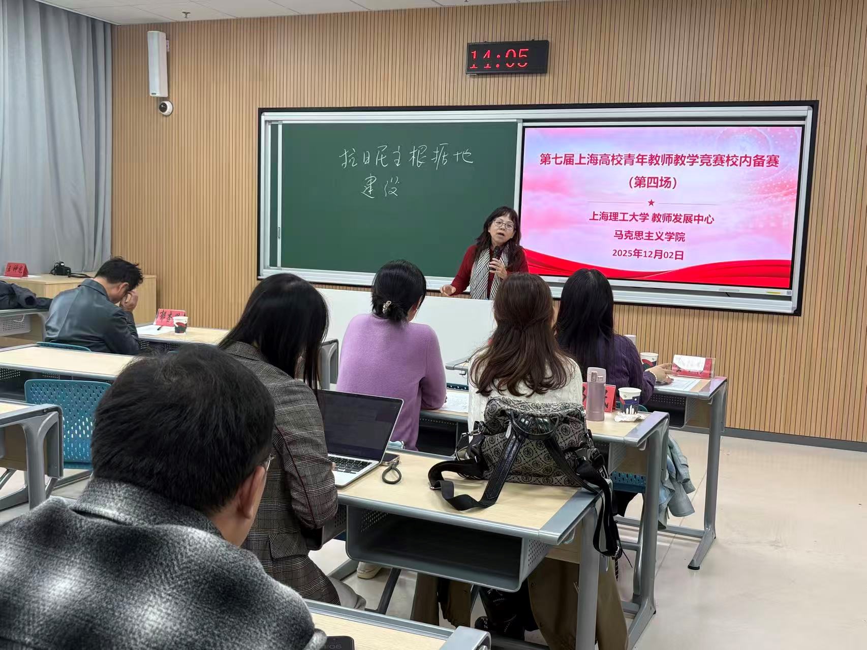 为进一步增强青年教师的立德树人意识和教育教学能力,提升人才培养质量和水平。12月2日,马克思主义学院在第三教学楼 601举办第七届上海高校青年教师教学竞赛校内备赛(第四场)暨马克思主义学院青年教师岗前培训校本研修(试讲)活动。活动邀请上海市研究生思政课教指委副主任委员、上海财经大学马克思主义学院教授张桂芳,上海理工大学材料与化学学院副院长李生娟,机械学院副教授王神龙,马克思主义学院教授、院长金瑶梅,马克思主义学院副教授、教研部主任史玉担任评审专家。学校教学发展中心主任童元伟、景大雷教授、魏芬老师,华东师范大学教师培训中心冯珉、郁杏兴老师亲临现场给予指导。通过校内遴选的6名参赛教师,马克思主义学院4名试讲教师,以及马克思主义学院青年教师参加了本次备赛和观摩。活动由马克思主义学院副院长郭根主持。