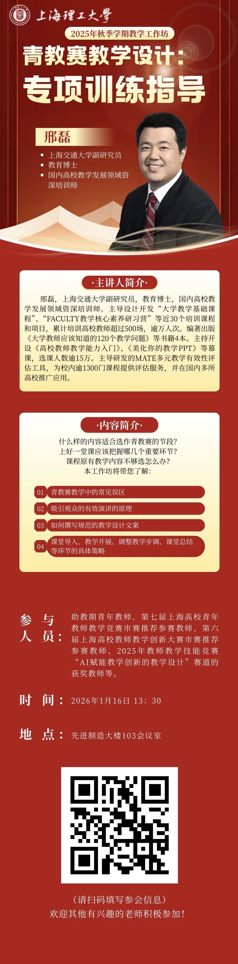 1月16日教学工作坊活动预告|青教赛教学设计:专项训练指导 作者:教师发展中心 2026-01-09